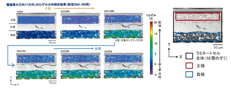 in-situ SEM画像を用いたDIC解析による全固体電池内のひずみ分布解析